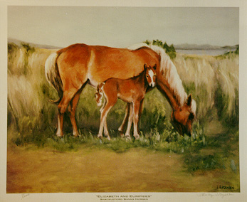 Shirley Leyshon of Elm City, North Carolina painted this portrait of Elizabeth and Euripides and a limited edition of 1000 prints is now available only through the Foundation for Shackleford Horses. The 18" X 24" print is being offered for $60.00 with 60% of the cost going to the Foundation to support their work with these wonderful wild horses. You can obtain your copy, first come, first served, by contacting Carolyn Mason at the Foundation.
