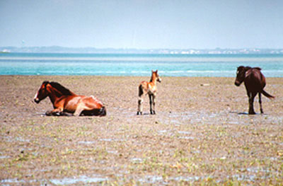 she was 8 hours old, she swam behind her dam back to Shackleford.