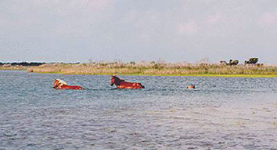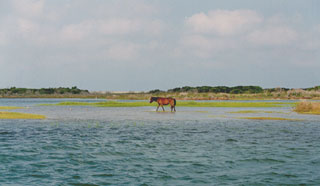 Carolina, live wild horses. They roam the dunes and marshes and swim